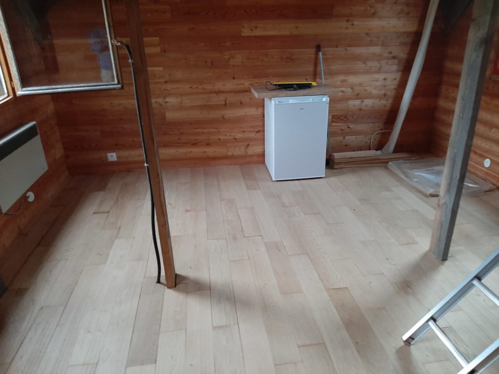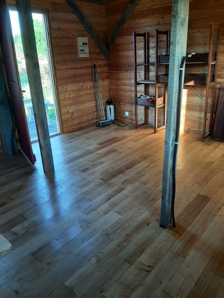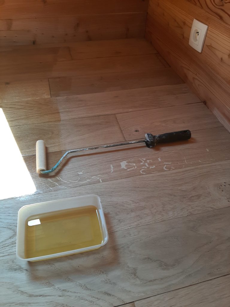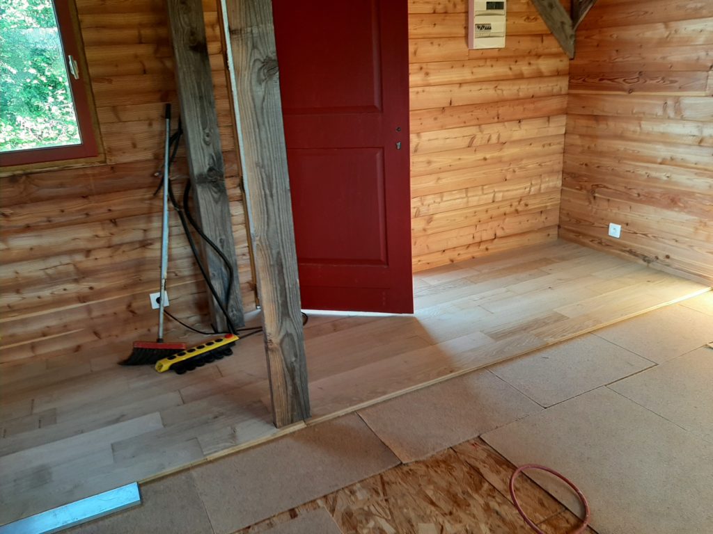 The floor is made of 19 mm OSB3 layer under 5 mm resilient layer under 20 mm oak board with hard oil protection